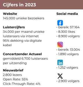 Dankzij het grote bereik en aanbod is de Concertzender een zeer interessant platform om uw boodschap onder de aandacht te brengen van een geïnteresseerd en cultuurminnend publiek.