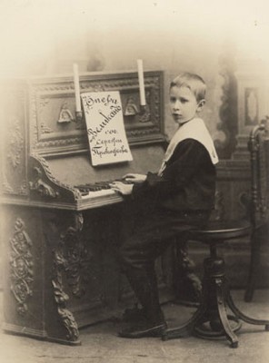 [Fotobijschrift Prokofjev: Sergej Prokofjev in 1900, op de piano de partituur van zijn opera De Reus, door Serjosja Prokofjev.]