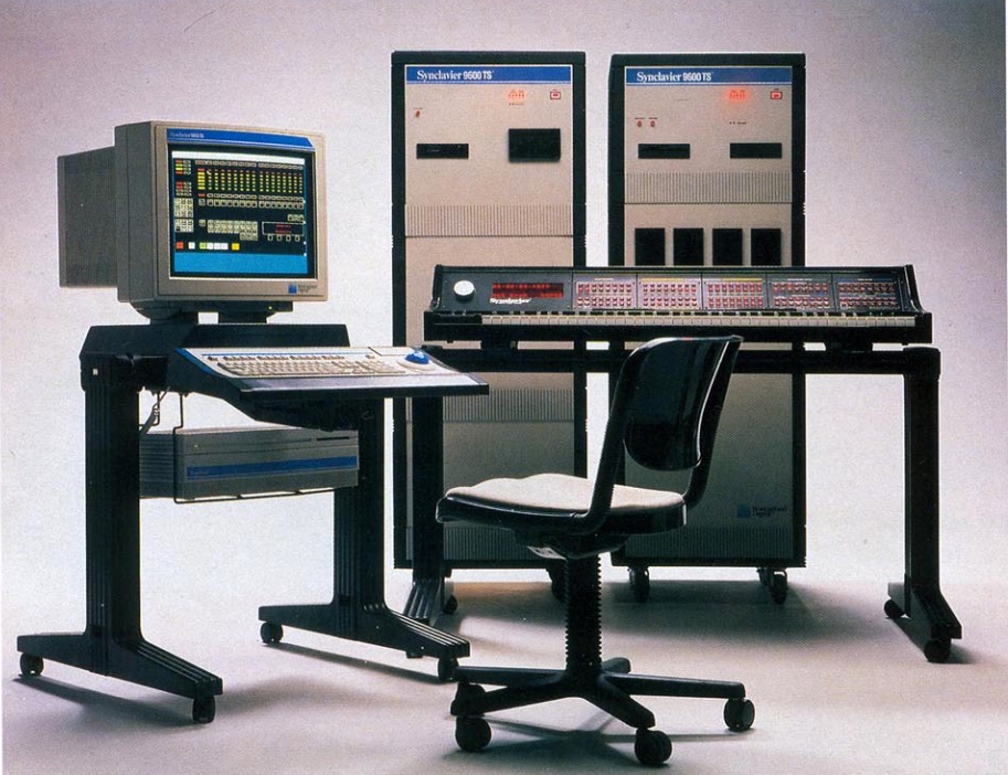 (Late version of the Synclavier II 9600TS system with an Apple Macintosh running a terminal emulator)