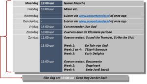 Geen dag zonder Bach blijft op elke werkdag om 13.00 tot 14.00 uur.
