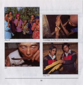 Imitation of the sound of water flowing of a waterfall. The đĭng tŭt is played during funerals at the house around the dead, at the burial place, or during ceremonies when the grave is abandoned and at the fields at the beginning of the rainy season.