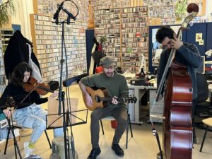 Remco Jacobs, gitaar en zang, Juliana Hahn, viool en zang en Minas Vakaloudis op contrabas treden op in de studio.