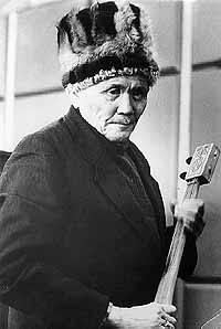 The heroic stories batyrlar and the epic throat singing kai are much appreciated. In the oral tradition these are important forms of handing down knowledge and cultural identity. Alexej Kalkin (1925-1998) was a famous storyteller from the twentieth century in Altai. His deep throat singing had a healing effect on the listeners, and that is why he is regarded as a shaman. We will listen to the epic story Bodai-Koo, performed by Alexej Kalkin and recorded in Tasjkent in 1973. He accompanies himself on topshuur, the Altai lute with two strings, which serves as a horse on which the singer runs through his story.