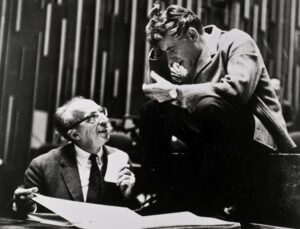 Leonard Bernstein en Aaron Copland tijdens de repetitie voor de wereldpremière van Coplands Connotations, Philharmonic Hall, 1962. Met dank aan de New York Philharmonic Leon Levy Digital Archives. (Foto: Bert Bial)