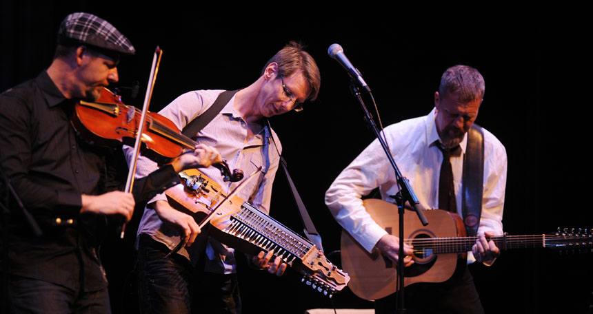 laatste speelt viool, de eerste de nyckelharpa, een traditioneel Zweeds instrument. De tonen worden verkregen door toetsen in te drukken die de snaren, gestreken door een strijkstok, verkorten. Daarnaast kent het instrument sympathiesnaren, snaren die meetrillen op de hoogte van de aangestreken toon. Je zou de nyckelharpa een draailier zonder wiel kunnen noemen.