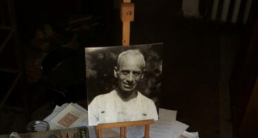 Gedenkportret van Mordechai Gebirtig in de werkkamer van zijn huis in Krakow.