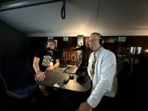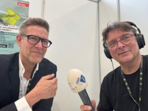 Met Mark van Schaick in de Radio Bremen bus en daaronder: in gesprek met JazzAhead Artistic Advisor Götz Bühler