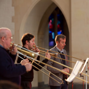 The reconstruction begins with atmospheric church bells, followed by festive horns, organ, Gregorian chant and the texts of the mass written by Andrea en Giovanni Gabrieli.