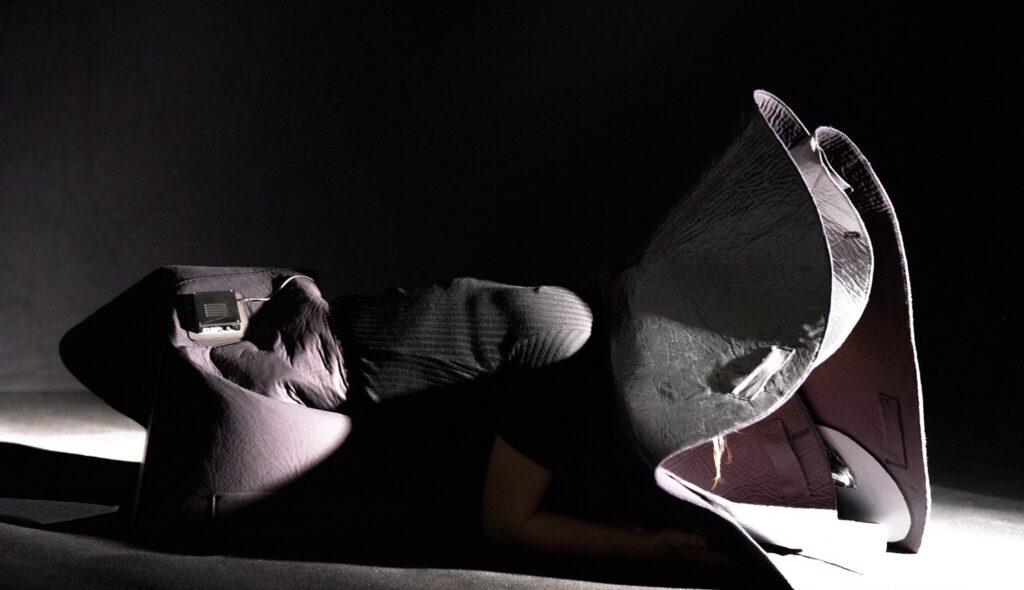 On Thursday September 16 2021, Janneke van der Putten presented a performance called the Voice-Skin about the limits and possibilities of the human voice in interaction with a portable sound system. Unconventional vocal techniques and spatial resonances are mixed with electro-acoustic sounds which are broadcast through loudspeakers mounted on the surface of the Voice-Skin. The movements of the vocalist during the performance constantly change the direction of the sound. In addition, the sound is enhanced by the shape of the Voice-Skin and by the architecture of the space in which the performance takes place.